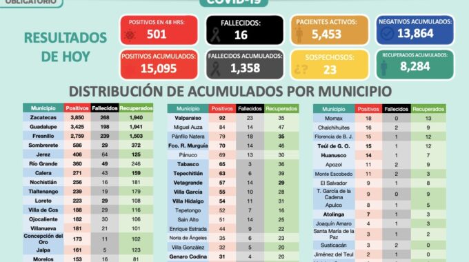 El municipio Fresnillo registra 113 casos; Zacatecas, 115; Guadalupe, 84; Villanueva 28; Río Grande, 25; Jerez, 20; Nochistlán, 18; Sombrerete, 17; Tlaltenango, 16; Pinos, 11; Juan Aldama, ocho; Calera y Concepción del Oro seis, cada uno; Trancoso y Loreto cinco, cada uno; Jalpa, Ojocaliente y Miguel Auza cuatro, cada uno.