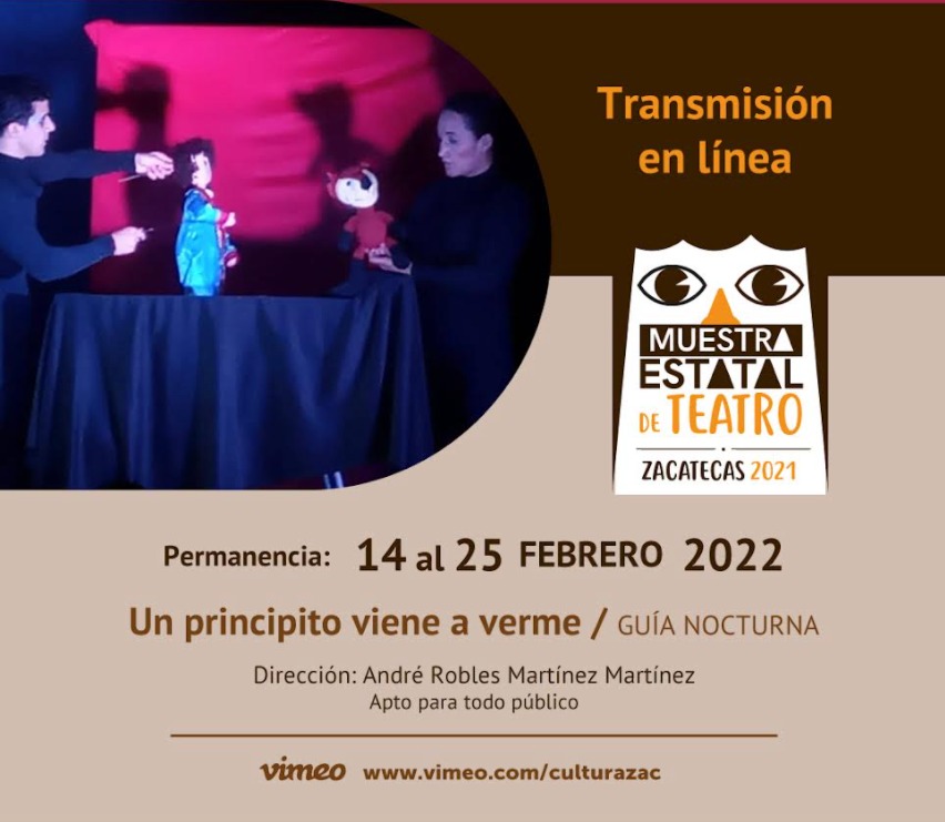 Zacatecas, Zac., 14 de febrero de 2022.- Para lograr un alcance mayor en la captación de públicos con respecto a las actividades, bienes y servicios culturales de Zacatecas, hoy inicia la transmisión en línea de las obras que integraron la Muestra Estatal de Teatro 2021.
