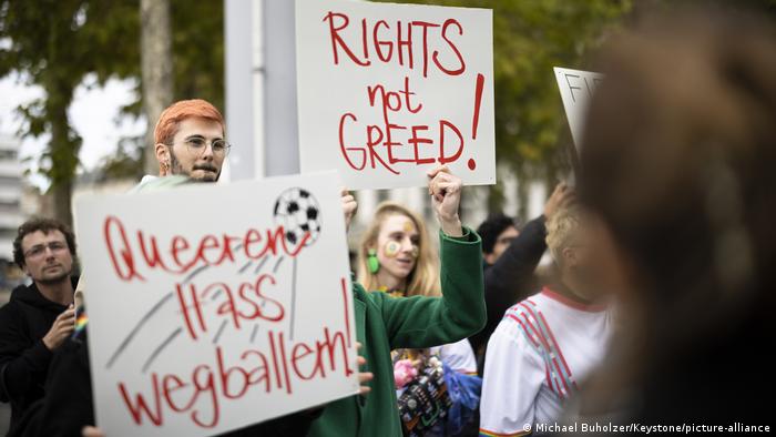 A menos de dos semanas de que comience la Copa del Mundo, Qatar ha prohibido a las personas LGBTI "mostrar en público afecto por el mismo sexo", o alojarse en una misma habitación de hotel, recordó Roman Heggli, secretario general de Pink Cross, otra de las asociaciones detrás de la manifestación junto a la Red Transgénero de Suiza (TGNS) y la Organización Suiza de Lesbianas (LOS).