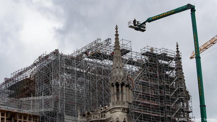 Las obras de Notre Dame, que fueron suspendidas durante el confinamiento por la pandemia del nuevo coronavirus, está en la delicada fase de retirada del andamio instalado antes del incendio y completamente deformado por las llamas.