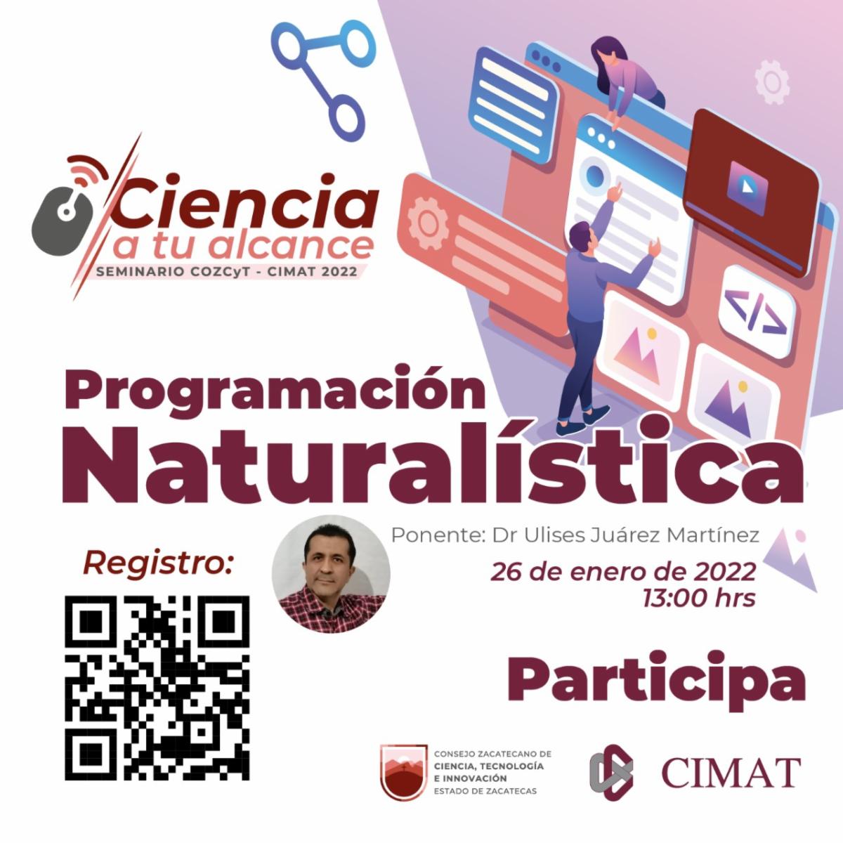 El Seminario Cozcyt-CIMAT 2022 arrancará el miércoles de esta semana, a las 13:00 horas, con la temática Programación Naturalística, a cargo del integrante del Sistema Nacional de Investigadores (SNI) Nivel 1, Ulises Juárez Martínez, actual docente investigador del Instituto Tecnológico de Orizaba, Veracruz, quien disertará sobre el avance y evolución de los lenguajes de programación.