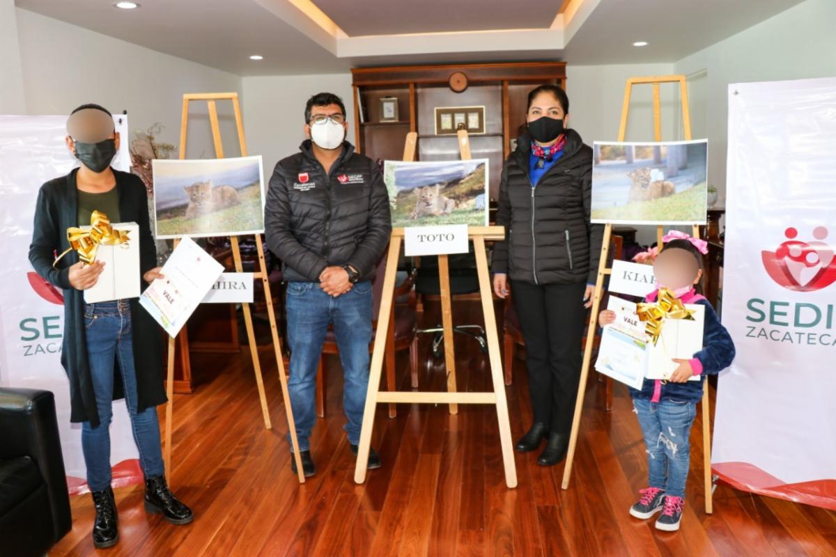 Zacatecas, Zac., 25 de Enero de 2022.- A nombre del Gobernador David Monreal Ávila, la Presidenta Honorífica del Sistema Estatal para el Desarrollo Integral de la Familia (SEDIF), Sara Hernández de Monreal, hizo entrega de sus premios a las ganadoras del concurso organizado por esta instancia de asistencia social, para nombrar a los cachorros de león del Parque y Zoológico La Encantada.