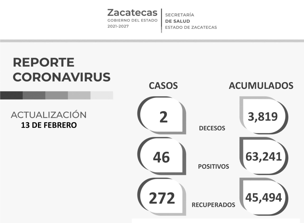 Zacatecas, Zac., 13 de febrero de 2022.- Este domingo, la Secretaría de Salud de Zacatecas (SSZ) reportó la recuperación de 272 pacientes tras superar el COVID-19, así como 46 nuevos casos positivos y dos lamentables decesos a causa de esta enfermedad.