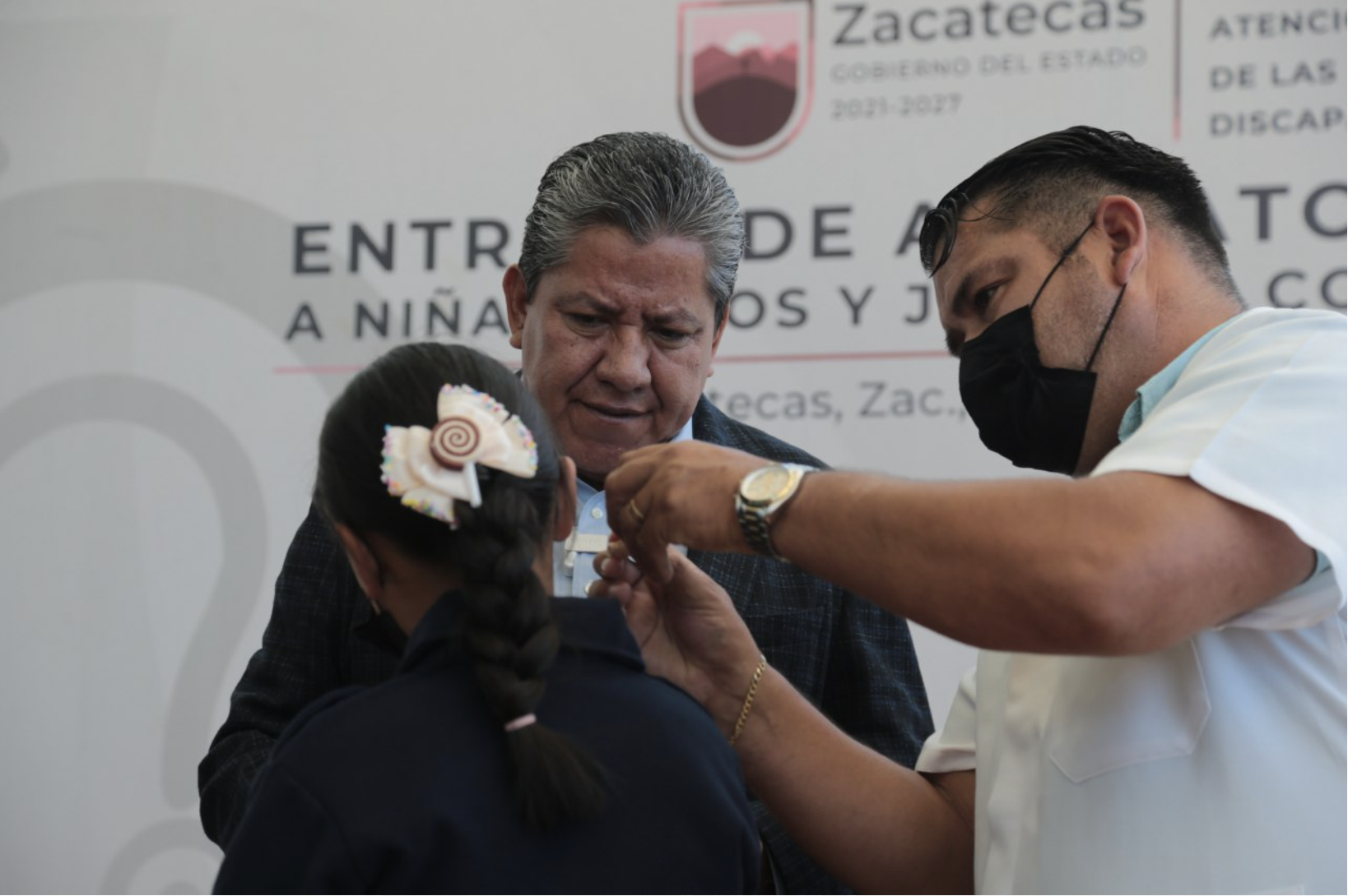 El Gobernador y el médico Carlos Carrasco colocaron los aparatos auditivos a algunos de los pequeños beneficiarios, entre ellos: Ángela Ruiz Méndez, de Guadalupe; Yamilet Rosales Díaz, de Sombrerete; Jorge Cortés Maldonado, de Teúl de González Ortega y Daniel García de Valparaíso.