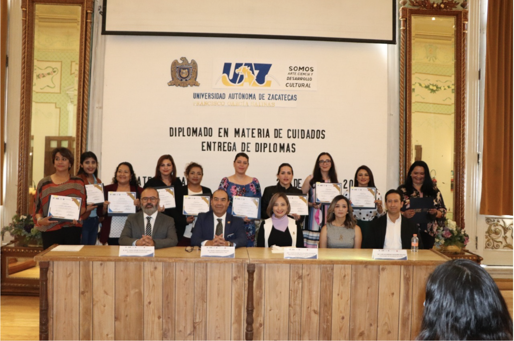 Un total de 15 mujeres, que culminaron con un trabajo teórico, práctico y vivencial para el desarrollo del tema en Cuidados, recibieron sus constancias de manos de la titular de la Semujer, Zaira Ivonne Villagrana Escareño; la coordinadora del Programa de Transversalidad, Marisol García; el Secretario General de la UAZ, Ángel Román Gutiérrez; el Secretario Académico, Hans Hiram Pacheco García, y el Coordinador de Vinculación de la UAZ, Luis Alejandro Aguilera Galaviz.