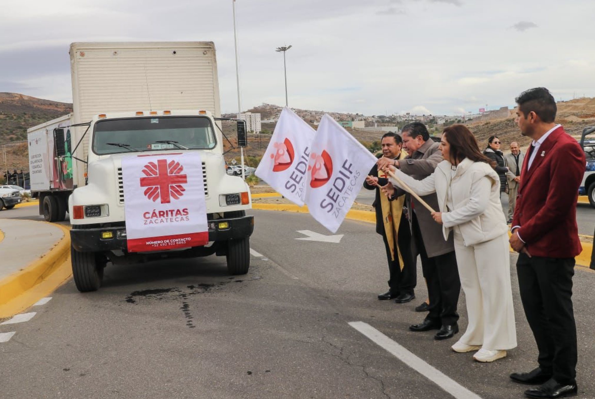 En una actividad encabezada por el Gobernador David Monreal Ávila y su esposa, la Presidenta Honorífica del Sistema Estatal para el Desarrollo Integral de la Familia (SEDIF), Sara Hernández de Monreal, se dio el banderazo de salida a los camiones que trasladan 14 toneladas de alimentos, cobijas, artículos de higiene, ropa y artículos de limpieza, recabados mediante integrantes de la Pastoral Social Cáritas, a través de una convocatoria con la sociedad civil zacatecana.