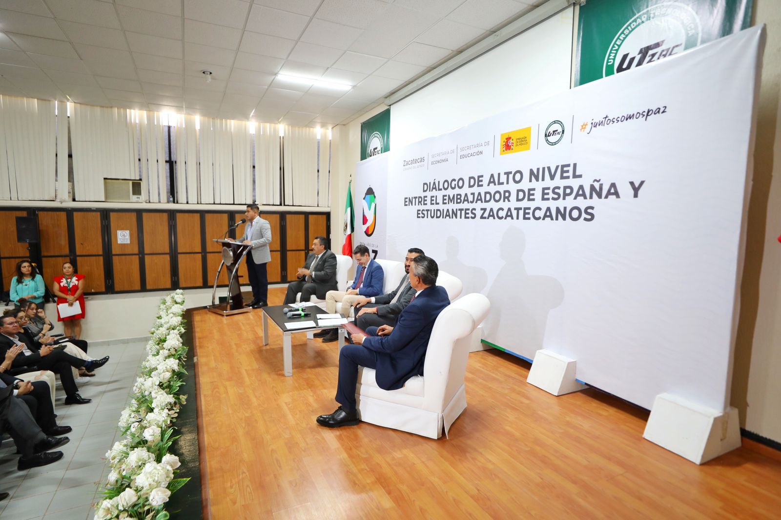 El intercambio de ideas se llevó a cabo en las instalaciones de la Universidad Tecnológica del Estado de Zacatecas (Utzac), con la participación destacada del Embajador de España en México, quien dialogó con estudiantes tanto de la institución sede como del Bachillerato General Militarizado, así como con empresarios locales y funcionarios públicos.
