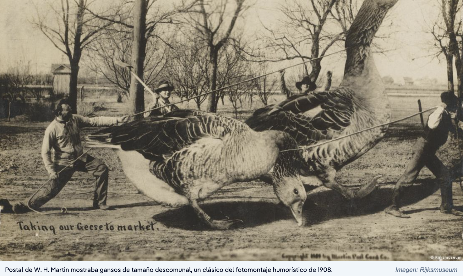 Un ejemplo llamativo de los primeros años del siglo XX es el del fotógrafo W. H. Martin, que en 1908 producía postales con productos agrícolas de tamaño descomunal. En lugar de capturar una escena tal cual, construía sus imágenes a partir de distintos fragmentos, realizando varias tomas por separado y combinándolas manualmente hasta crear una composición nueva que finalmente volvía a fotografiar para darle apariencia de unidad.